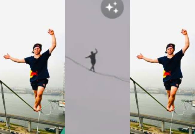 VIDEO: Man Walks On Rope Across Bridge, Train Tracks In Lagos